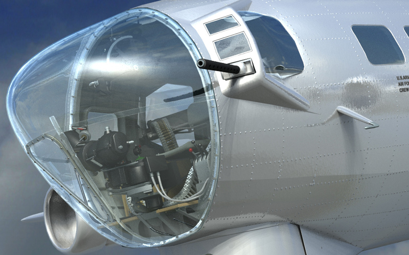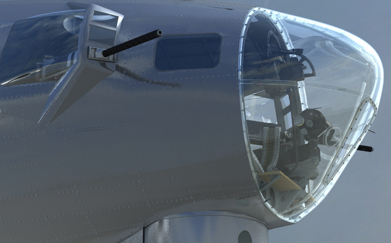 This is probably a lot closer to what might be seen in a finished painting. The chin turret sight gets lost in the glare, just like in every war-time photo I found of a B-17 nose. |