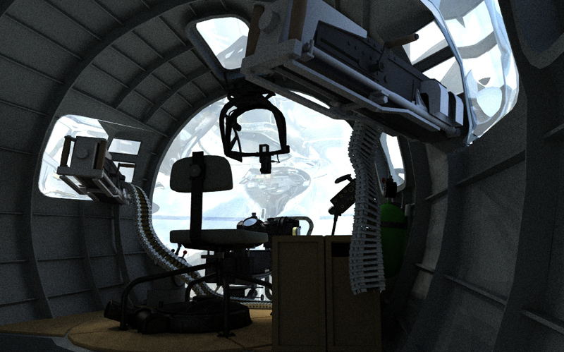 Even though in my painting I'll be showing the other side of the plane, I really liked this back lit view. It's also the best view of the chin gun sight hanging from the ceiling. And even then it's hard to tell what you're looking at. |
