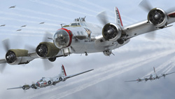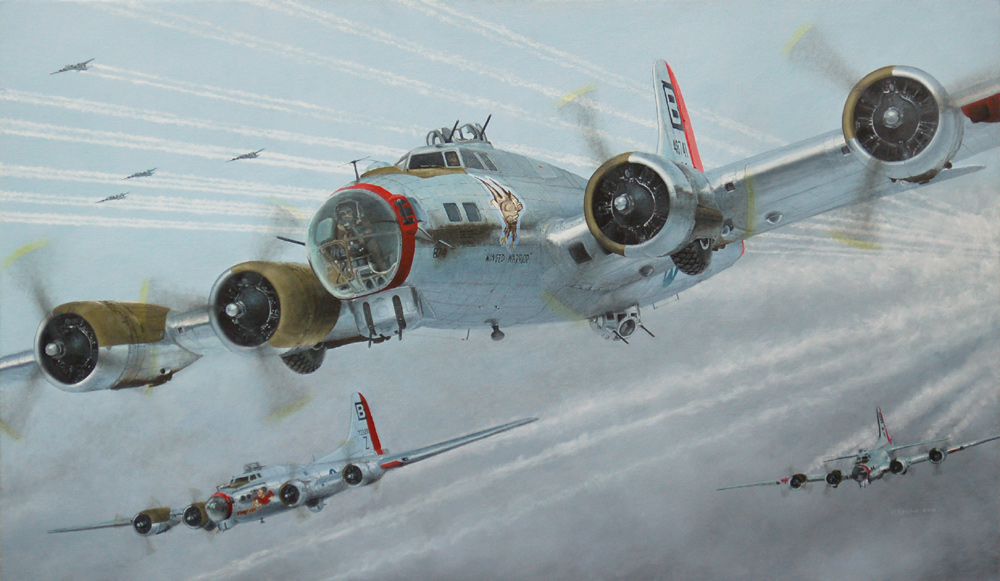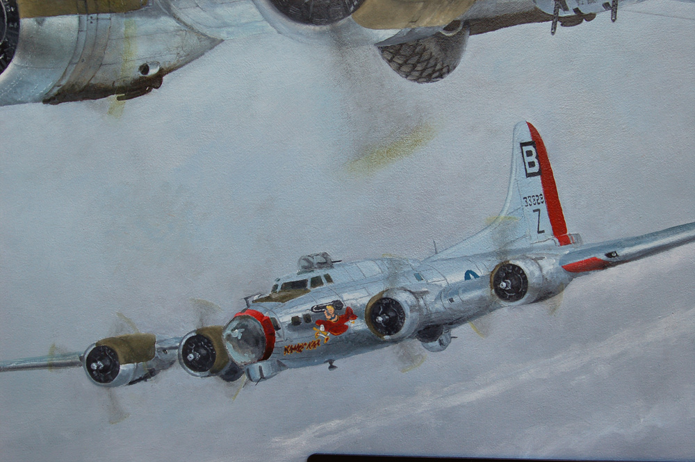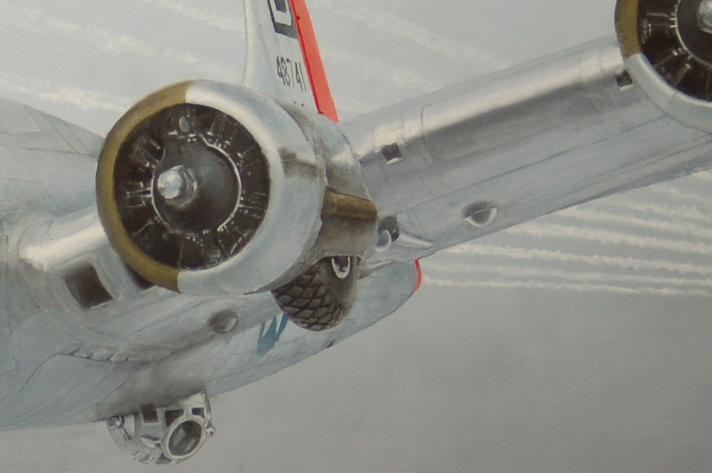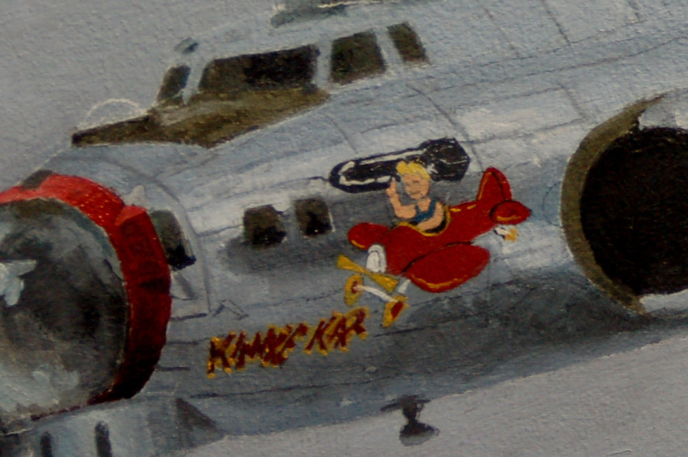 A lot more detail work today, most of it hard to see. I put in the flush rivets on the cowlings, finished out the exhaust/supercharger parts (all dark) on the undersides of the nacelles, and roughed in Kimmie Kar's engines. Also started to even out the sky/background below the main B-17. |