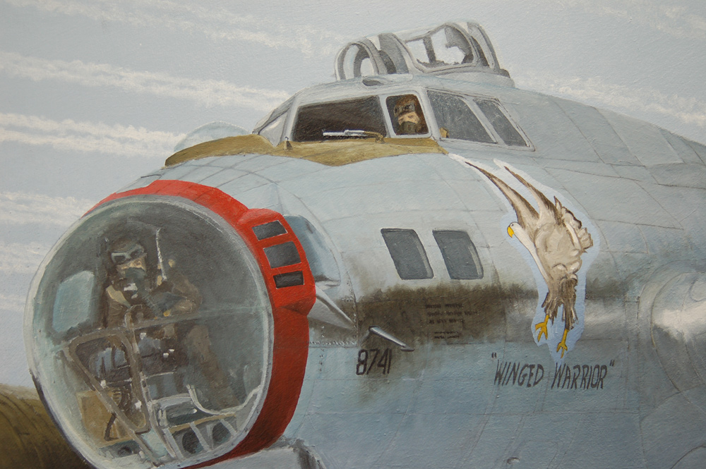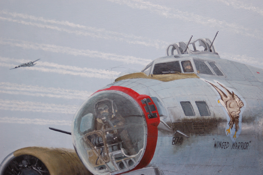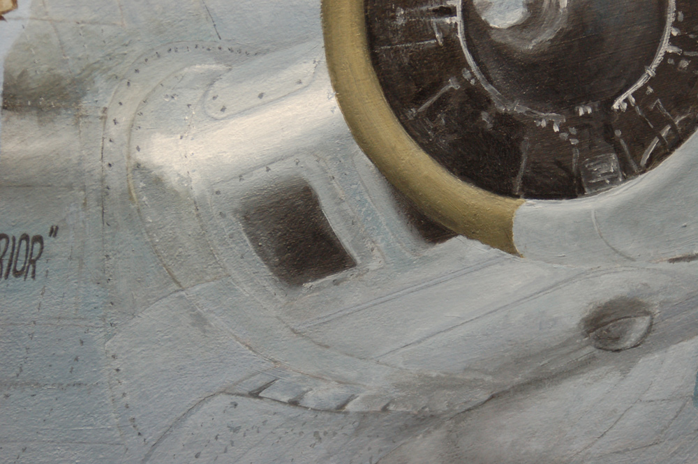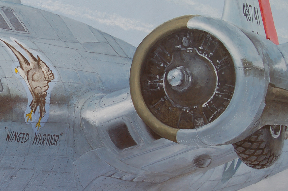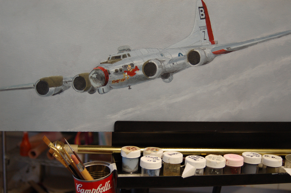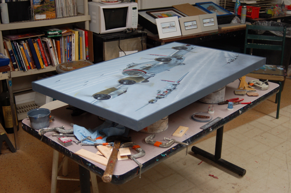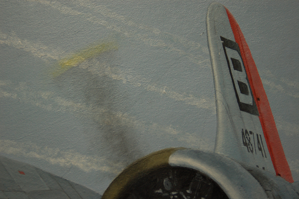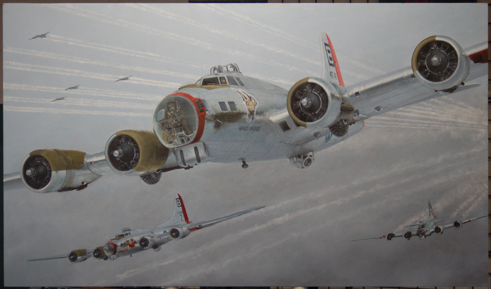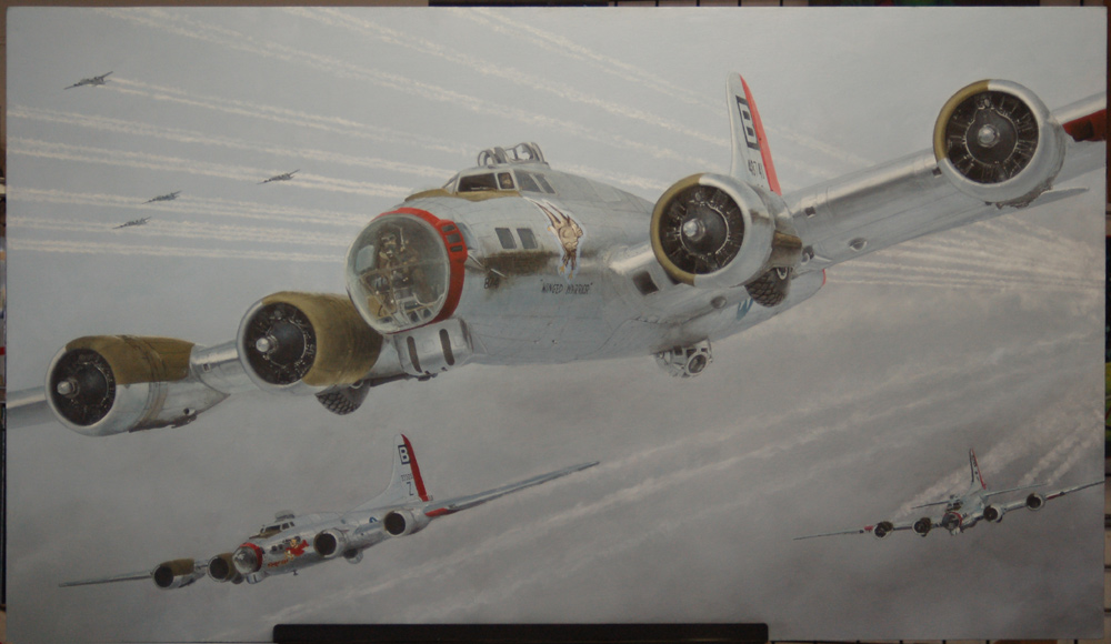 It's really done now. I didn't change anything today except for putting a simple strip frame around it. I also took it outside in direct sunlight and took some pictures. All the pictures I've taken up to this point, the color in the photos always seemed a bit “off” to me. But the ones in the direct sunlight really seem to get the colors right, at least on my laptop they look pretty good. The only downside is that the varnish I put on last night makes little glints here and there where the surface of the painting isn't perfectly flat. You can click on the first image below and see a full resolution version. Tomorrow the painting goes to Wilmington to be delivered to Robert Newman, the B-17 pilot who flew Winged Warrior on 9 missions. |