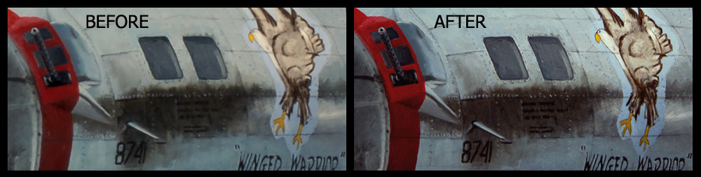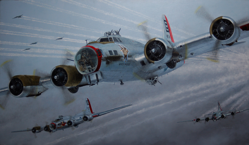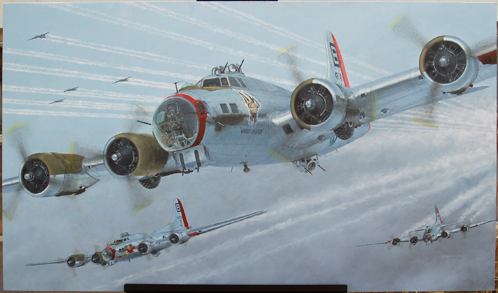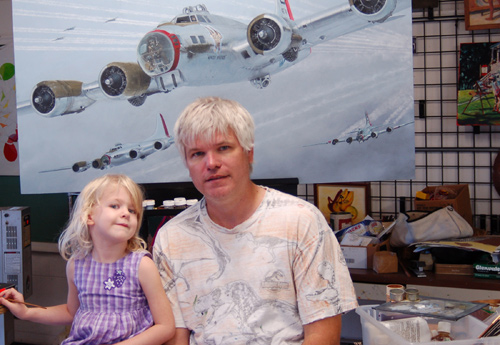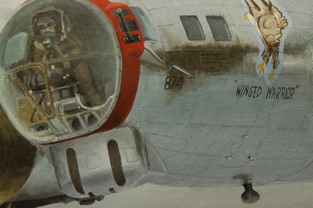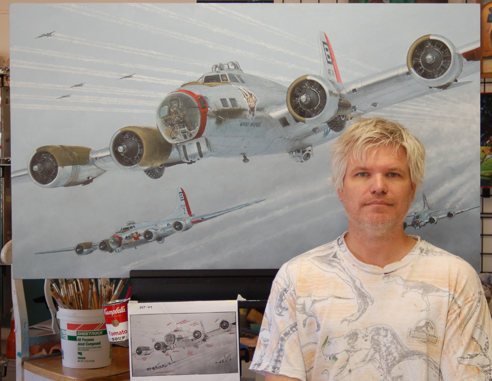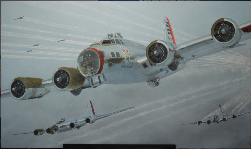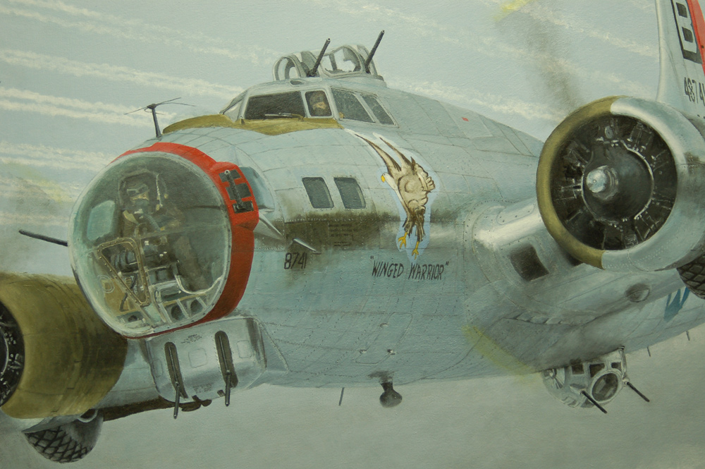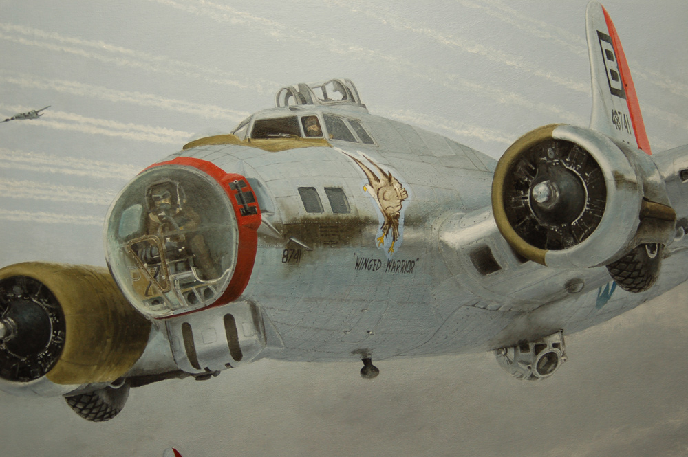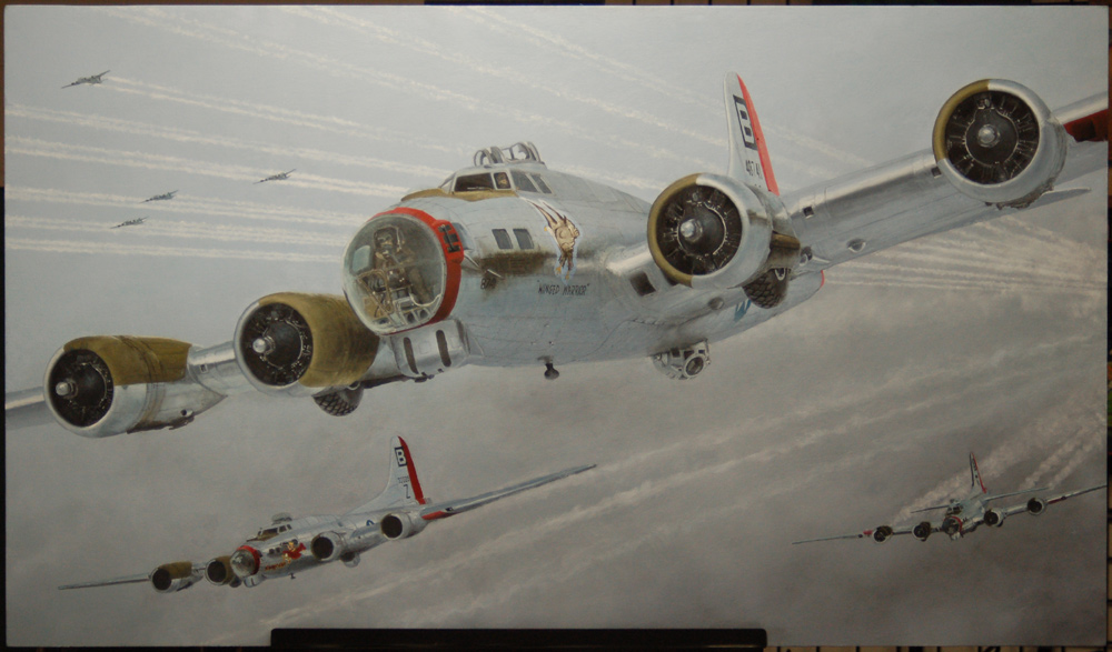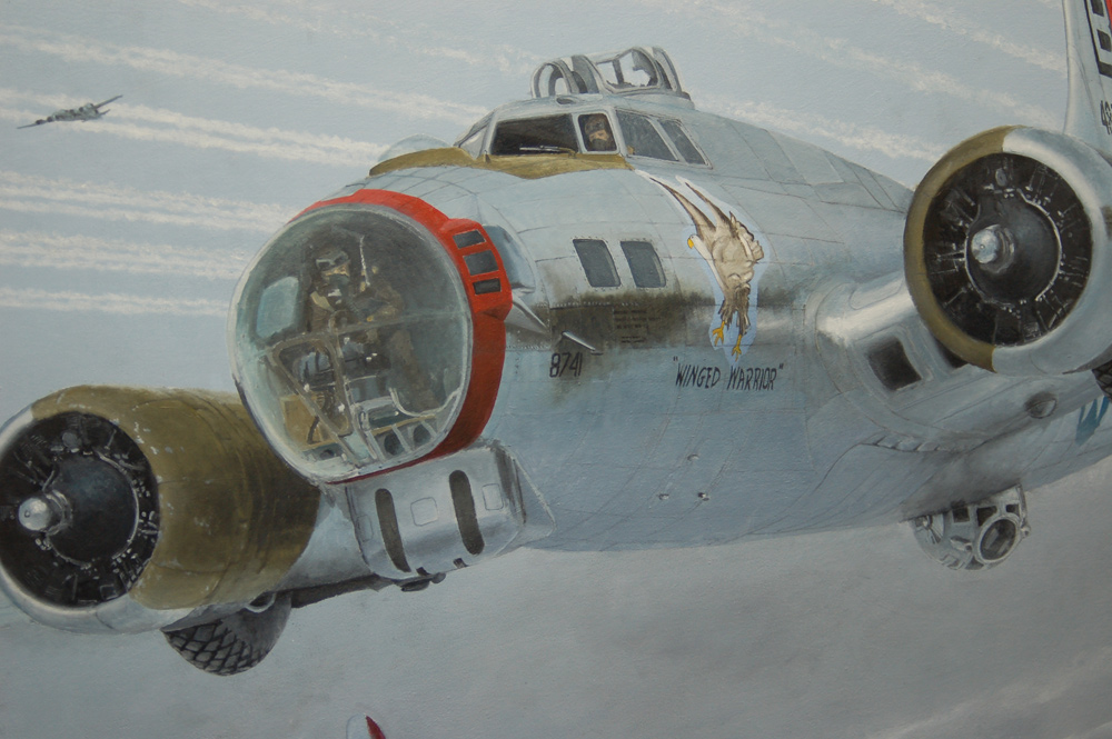 It's really done now. I didn't change anything today except for putting a simple strip frame around it. I also took it outside in direct sunlight and took some pictures. All the pictures I've taken up to this point, the color in the photos always seemed a bit “off” to me. But the ones in the direct sunlight really seem to get the colors right, at least on my laptop they look pretty good. The only downside is that the varnish I put on last night makes little glints here and there where the surface of the painting isn't perfectly flat. You can click on the first image below and see a full resolution version. Tomorrow the painting goes to Wilmington to be delivered to Robert Newman, the B-17 pilot who flew Winged Warrior on 9 missions. |