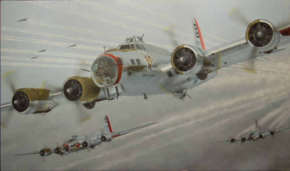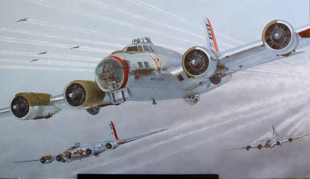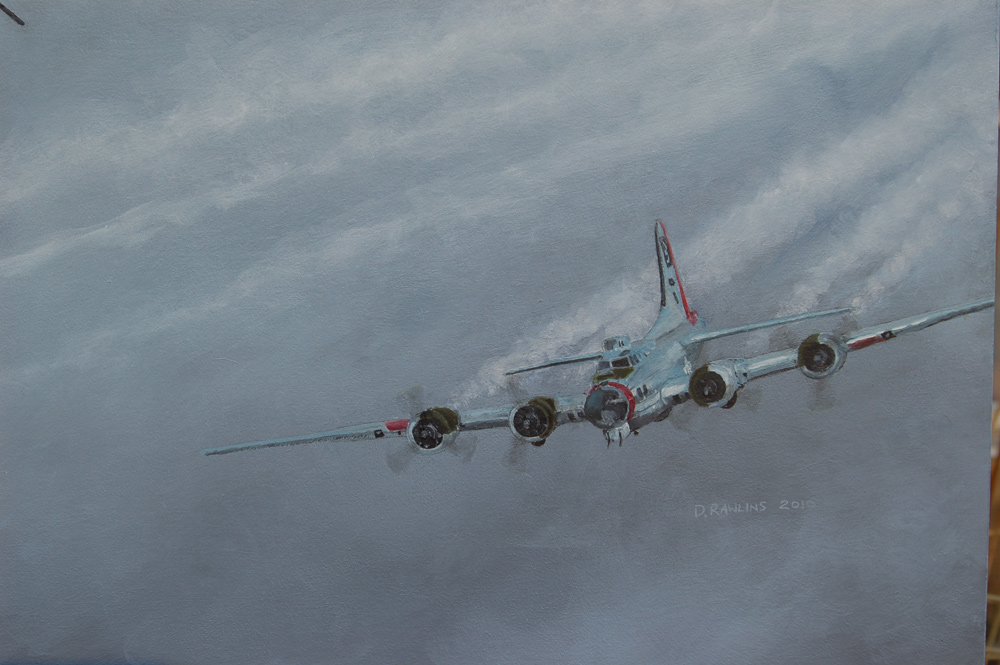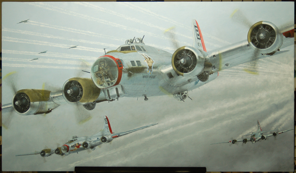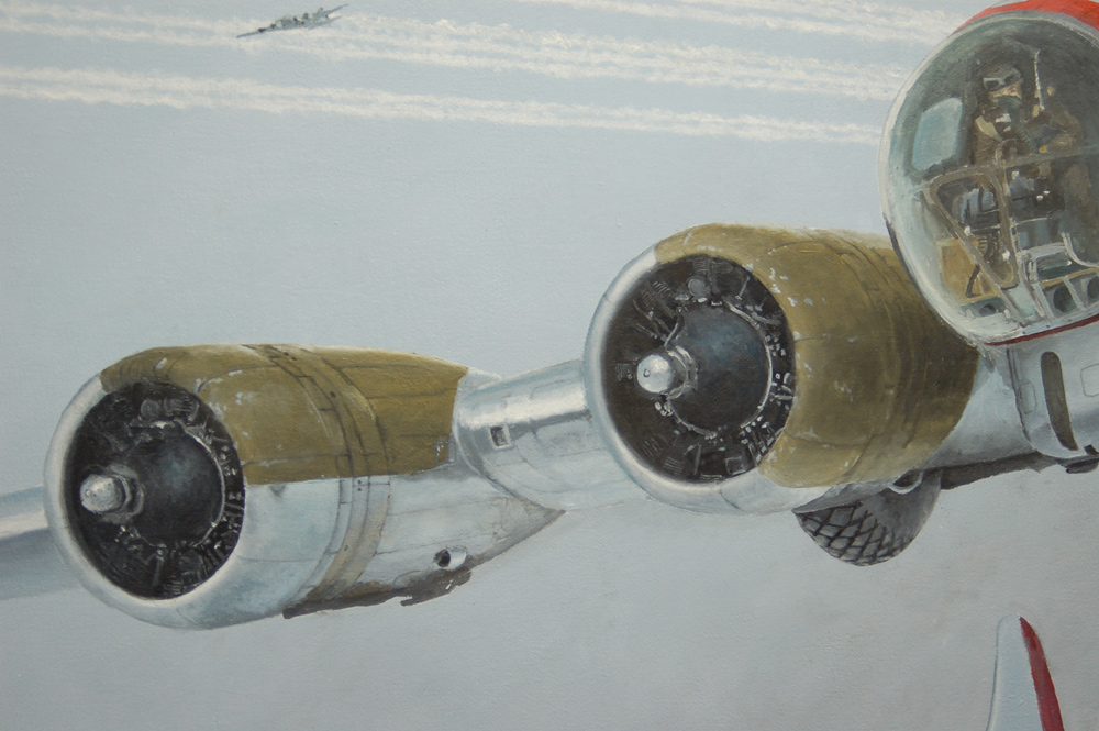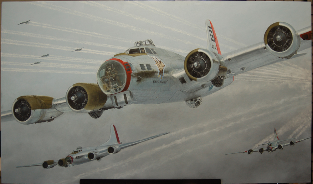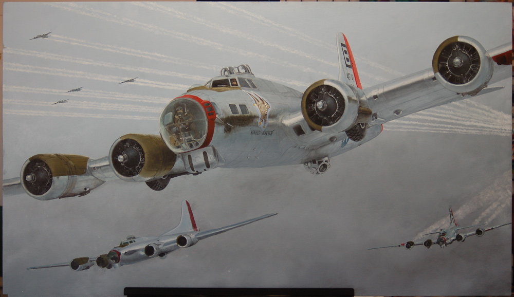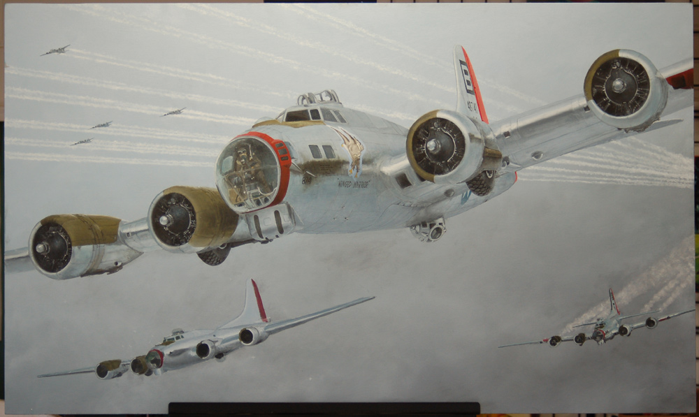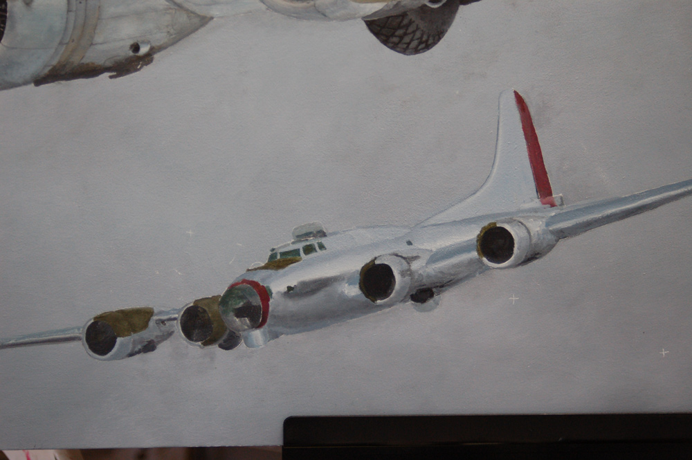 Almost there... I did a lot of very minor things this morning. Most of them invisible if you're more than 3 ft. away from the painting. Probably the most obvious was a lot of smearing around of the sky and working on contrails. On the B-17 itself, probably the most noticeable thing is the reflection of the cheek gun in the nose plexi. And the cooling holes in the barrel sleeve of that gun. Now I'm going to let this dry for a few days before coming back and putting in the rest of the guns and antennas. Also the propellors. The props are my last chance to really mess this up. (All these photos today were taken outside, except for the last one.) |