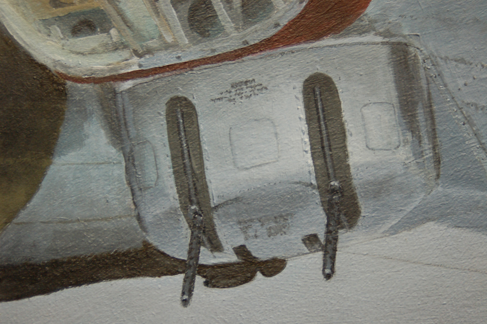 Only got in about 3 hours of painting today, most of which was doing hard to notice details. The only real “obvious” changes are the beginnings of the .50 cal gun in the cheek blister and the ADF football beneath the fuselage. Less obvious would be getting the right wheel (right wheel of the plane, meaning the wheel on the left in the painting) to finally look round, refining the optical bomb sight glass and frame in the nose and a little work on the ball turret. |