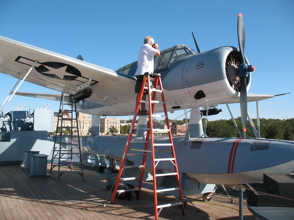 Back in December of 2009, after I had finished a P-51 painting for Steven, the next painting I had planned on working on was of an OS2U Kingfisher, a US Navy float plane used for observation and scouting in WWII. Then I got sidetracked for “several months” working on the B-17 painting. There are only 9 Kingfishers preserved and one of them just happens to be in Wilmington, NC. It's perched on the deck of the USS North Carolina, a WWII battleship that's now a museum. So, earlier in the week I contacted Kim Sincox, the Museum Services Director for the battleship to see if I could get better access to the Kingfisher than the average visitor might. They happily provided a 10 and 12ft ladder so I could get a vantage point above the wings of the plane. After taking about 300 photos of the plane, we spent the rest of the day somewhere deep inside the ship where the archives are, digging through old photos and scanning them into my laptop. |